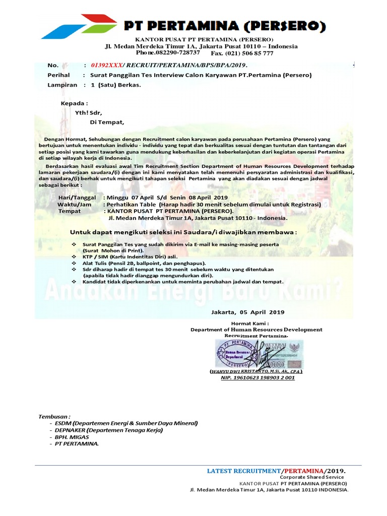 Pertamina @pertamina pada instagram, linkedin, facebook ,twitter dan tiktok, serta pada akun social media resmi rekrutmen @pertaminacareer untuk informasi seputar rekrutmen pertamina group, informasi karir, penipuan, dsb nya. Mulai dari pengisian aplikasi secara online, hingga cek kesehatan dan wawancara dengan manajemen pertamina. Ditemukan kejanggalan dalam konten pengumuman rekrutmen palsu. Tahapan untuk proses rekrutmen pt pertamani ini adalah sebagai berikut : Sangat mudah mendengar kabar tentang rekrutmen apalagi sekarang semakin dimanja dengan adanya group whatsapp, sharing via line, bbm, fb, twitter, dll.